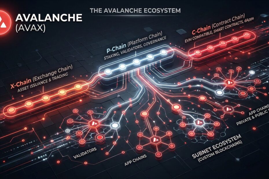 Avalanche’s most distinctive structural feature is its use of three separate blockchains, each optimized for a specific purpose. This stands in contrast to most blockchains, which use a single chain to handle all activity. The three chains communicate seamlessly but are independently optimized.